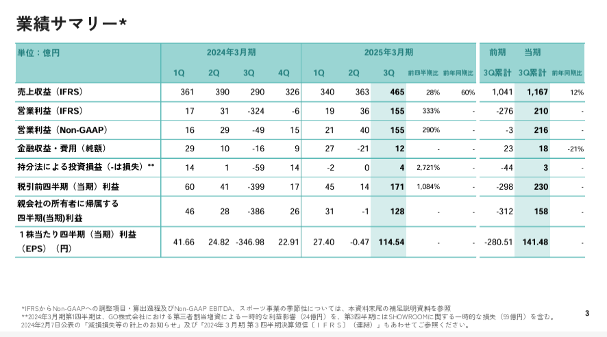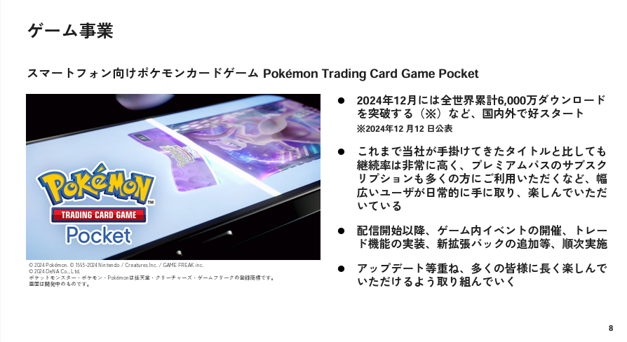 ディー・エヌ・エー(DeNA)<2432>は、2月7日、2025年3月期の第3四半期累計(4~12月)の連結決算(IFRS)を発表、2024年10月30日に新規リリースした『Pokémon Trading Card Game Pocket(ポケポケ)』が順調に推移し、2ケタ増収・大幅黒字転換での着地となった。