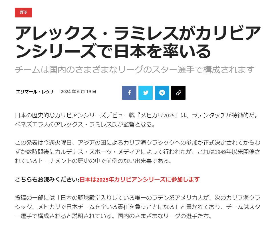 2025年にメキシコで行われるカリビアンシリーズ(中南米のウィンターリーグ王者が集まる大会)に日本チームが参戦。現地メディアによるとアレックス・ラミレス氏が監督を務める予定。